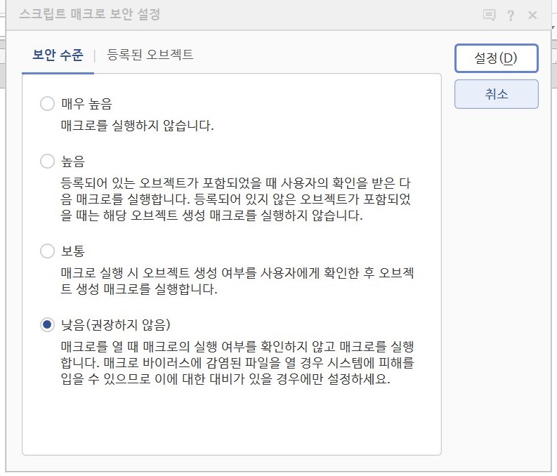 매크로 보안 설정을 누르고 "낮음(권장하지 않음)"으로 변경하자.