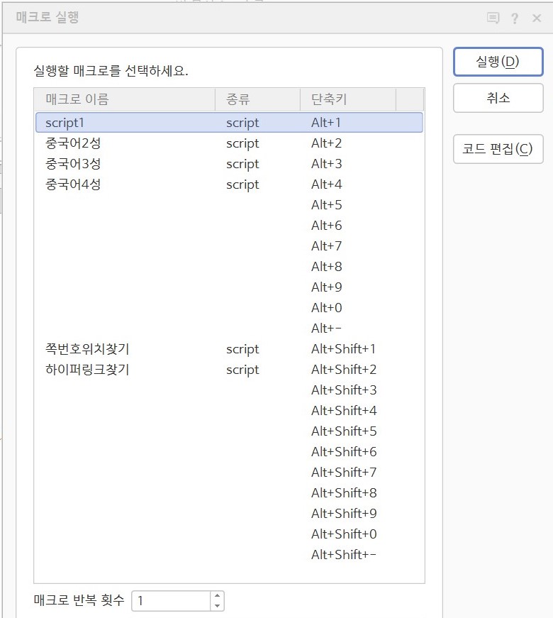 (매크로 반복 횟수는 위에서 본 "매크로 실행" 화면에서도 지정할 수 있다.)