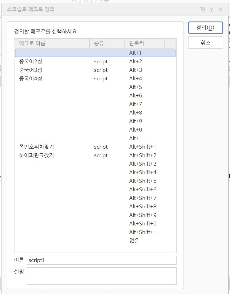 위에서 봤던 스크립트 매크로 버튼을 누르고 매크로 정의를 눌러보자.