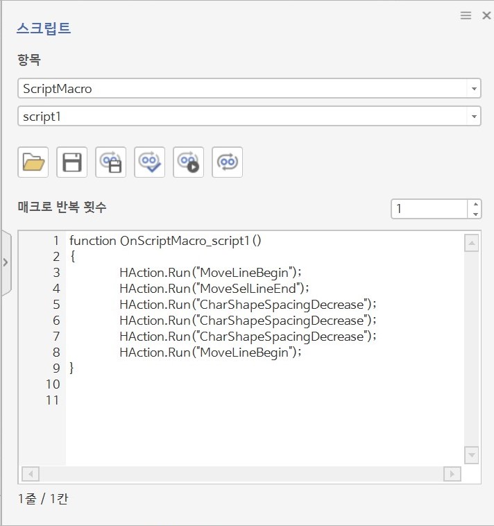 보아하니 HAction.Run("CharShapeSpacingDecrease"); 부분이 자간 조정을 한번 하는 것 같으니, 세줄을 더해준다.