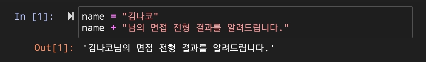 아마 + 연산자를 이용해 문자열을 붙이는 방법이 파이썬 문법을 공부하지 않더라도 가장 직관적으로 알아보기 쉬운 방법이 아닐까 싶다.
