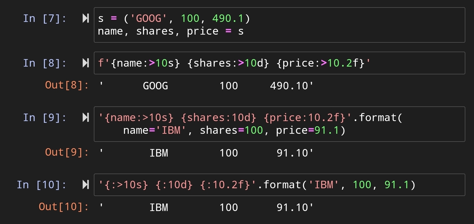 한편, 문자열 포맷에 대입되는 변수별로 표시 옵션을 지정해줄 수가 있다. 설명은 생략하고 예시만 몇 개 소개한다.