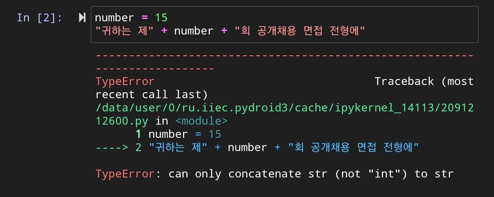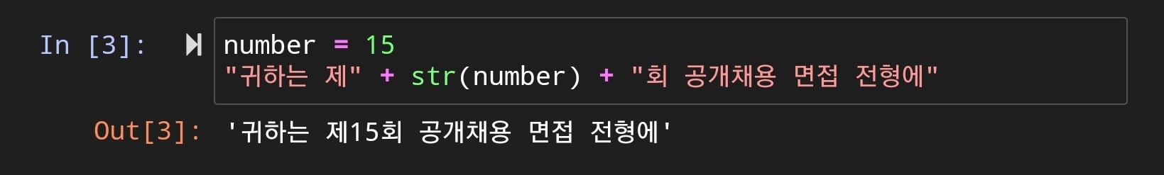 이 경우 str 함수를 이용해 숫자를 문자열로 변환한 뒤에 더해주는 방법으로 오류를 막을 수 있다.