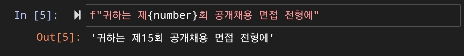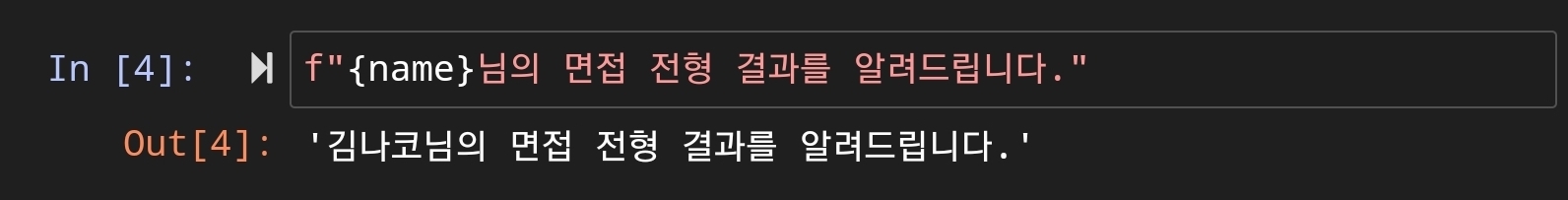 f-string은 아래와 같이 따옴표 앞에 f를 붙여주고, 변수를 대입해 변화시킬 부분에는 중괄호를 넣고 괄호 안에 변수명을 넣는 방법이다.