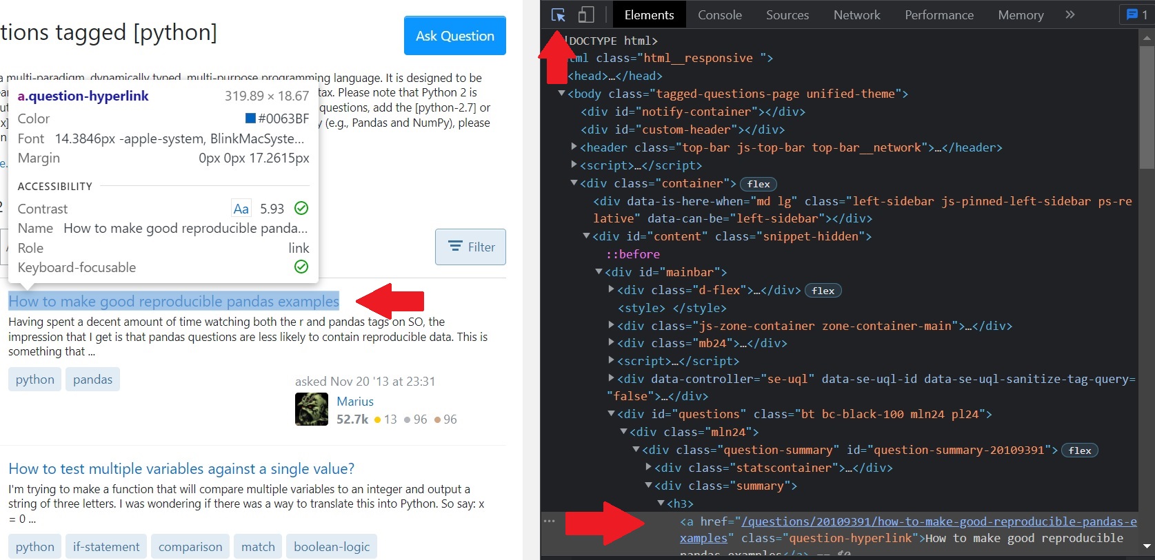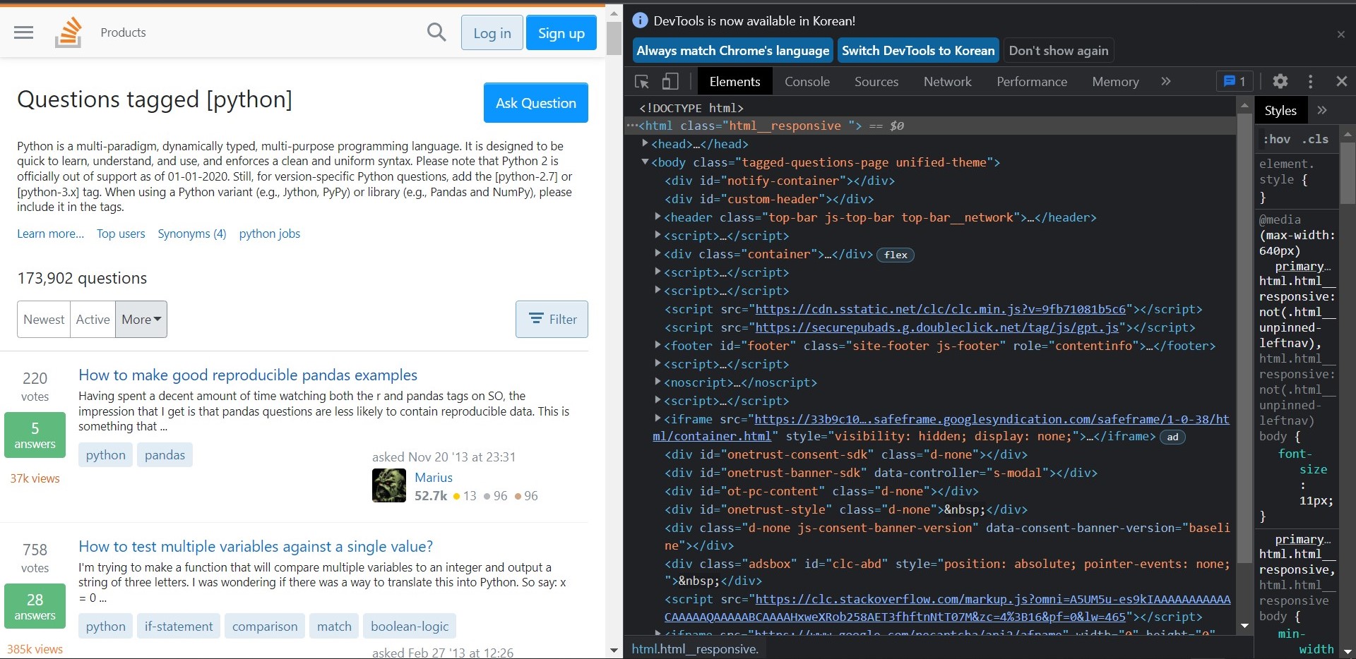 아래 URL은 코딩을 공부해본 사람이라면 누구나 한번쯤 들어가봤을 stackoverflow에서 태그가 python이고, 빈도(frequent) 기준으로 정렬한 질문 목록을 보여주는 페이지이다.