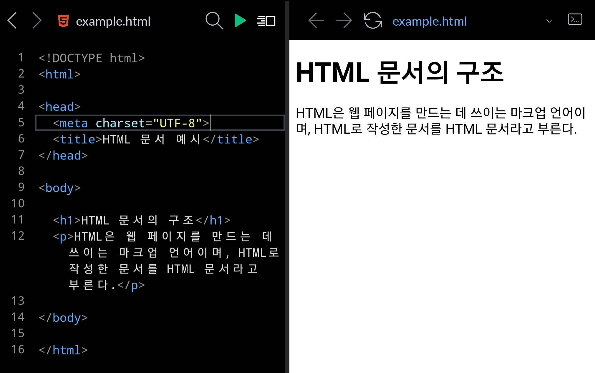 HTML 문서의 기본 구조를 보자. 왼쪽이 HTML 소스이고, 오른쪽이 브라우저에 나타난 모습이다.