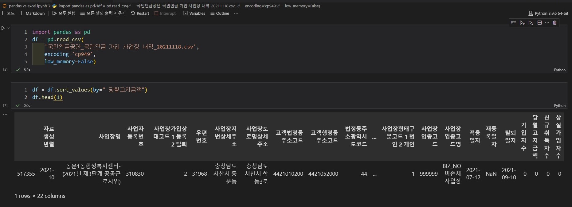 파일을 로드하는 데 6.2초, 당월고지금액 기준으로 정렬하는 데 0.6초가 걸렸다.