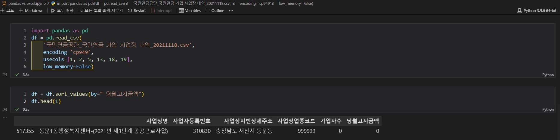파일을 로드하는 데 3.8초, 당월고지금액 기준으로 정렬하는 데 0.3초가 걸렸다.