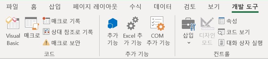 매크로는 엑셀 리본 메뉴의 "개발도구" 탭에서 사용할 수 있는데, 만일 독자가 사용 중인 PC에서 개발도구 탭이 안 보인다면 이를 먼저 활성화해줘야 한다.