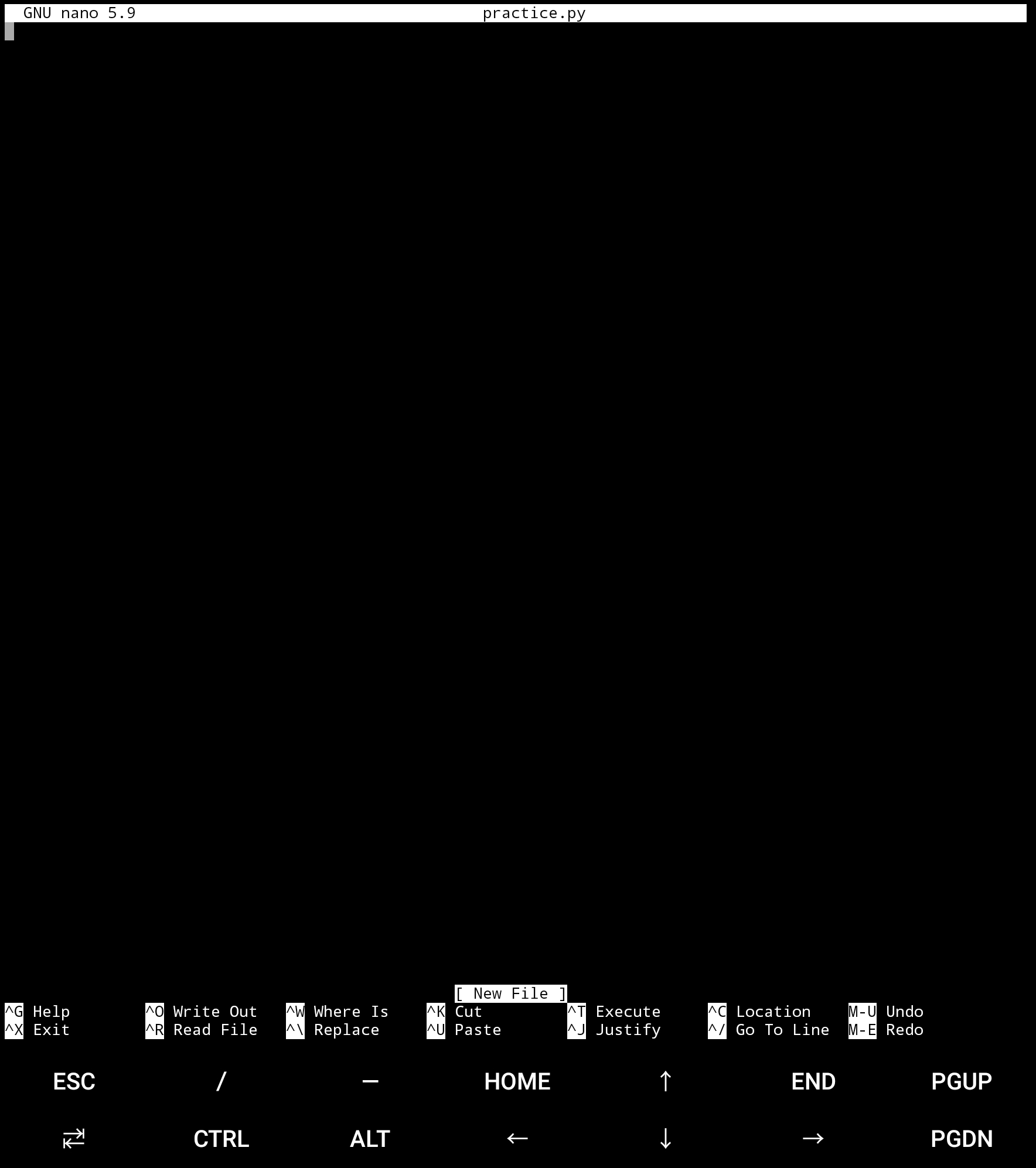 그러면 아래와 같이 텍스트 에디터인 nano가 열릴 것이다. 상단의 파일명을 보면 위에서 입력한 practice.py로 되어 있다.