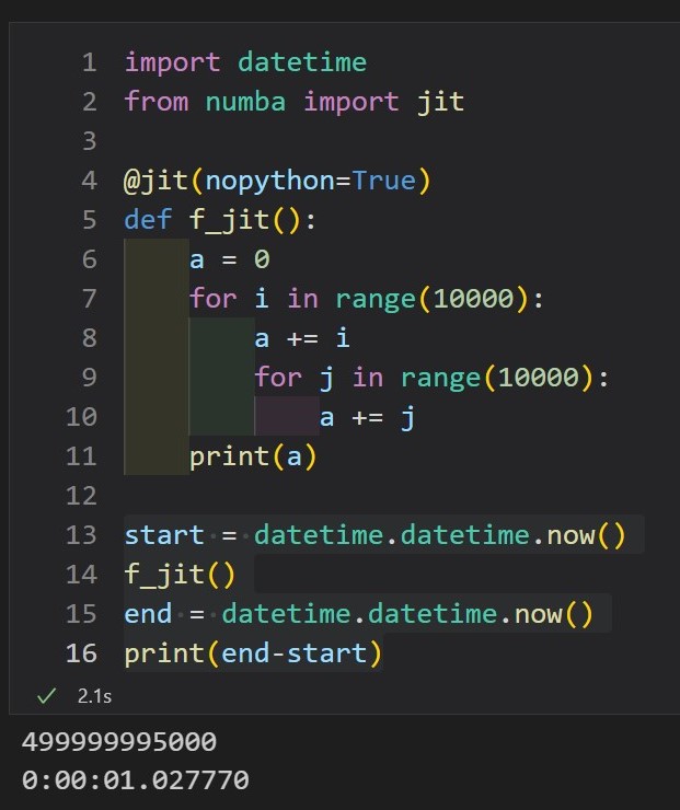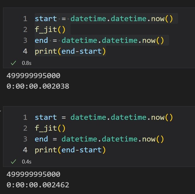 따라서 프로그램 내에서 함수를 처음 실행할 때에는 컴파일할 시간이 필요하며, 2번째 이상 실행할 때에 비해서는 시간이 좀 더 걸리는데, 이 때도 순수 Python으로 할 때보다는 훨씬 빠르다.