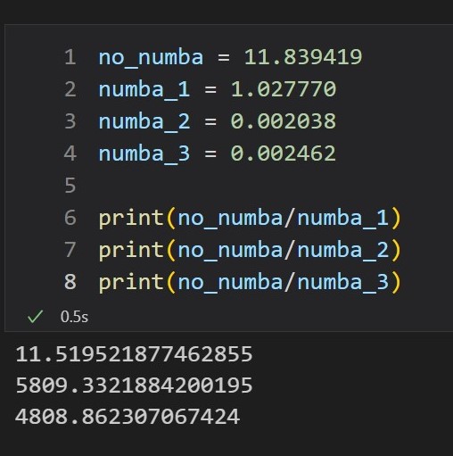 (nopython=True를 넣게 되면 numba가 컴파일 할 수 없는 코드가 있는 경우 오류가 나면서 중단되고, 넣지 않으면 순수 python과 같은 속도로 실행되는데, 속도 향상이 없다면 numba를 쓸 이유가 없을 것 같다.)