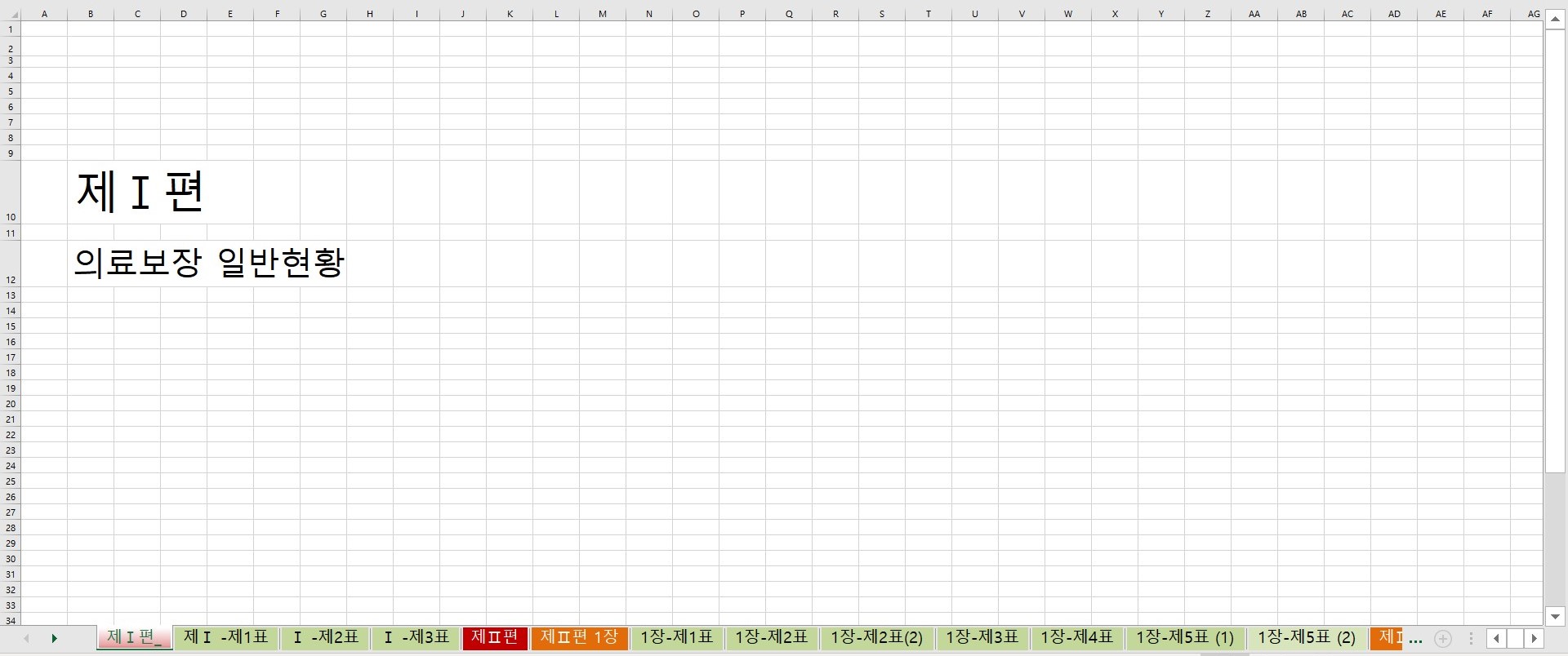 예를 들면 건강보험공단에서는 "의료급여 통계연보" 자료를 엑셀 파일 형태로 제공하고 있는데, 파일을 열어 보면 아래와 같이 시트 하나에 통계표 하나씩, 수십 개의 시트가 있다.