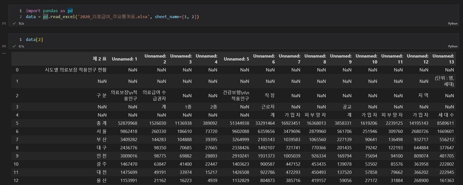 data = pd.read_excel('2020_의료급여_주요통계표.xlsx', sheet_name=[1, 2])