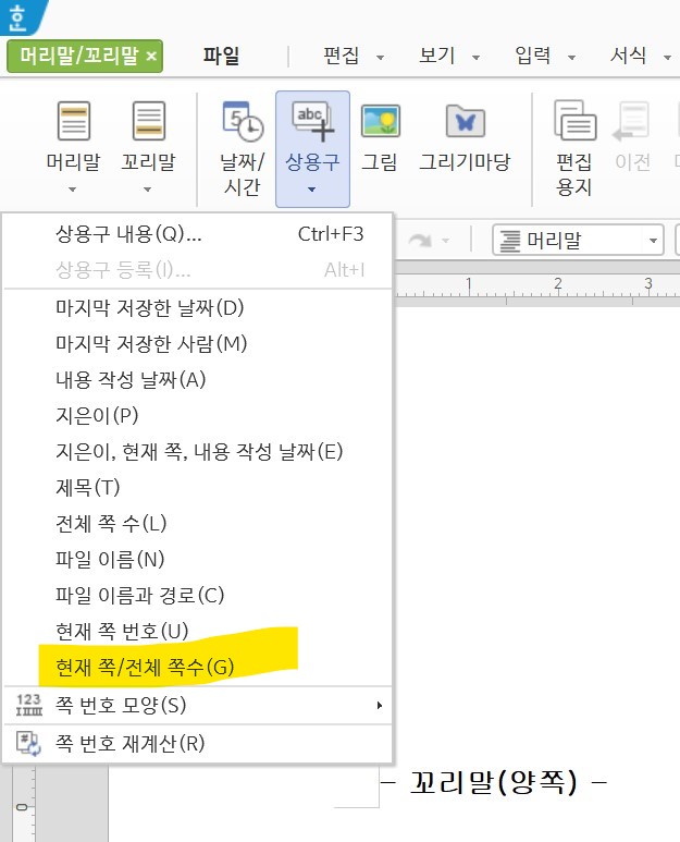 그러면 꼬리말 편집 상태가 되는데, 위에 나타난 메뉴 중에 "상용구"를 누르고, 밑에서 세 번째에 있는 "현재 쪽/전체 쪽수"를 선택해준다.