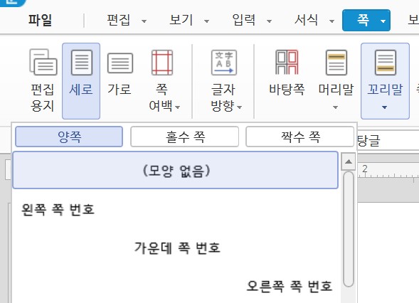 먼저, "쪽" 메뉴에서 "꼬리말"을 선택하고, "(모양 없음)"으로 꼬리말을 생성해준다.