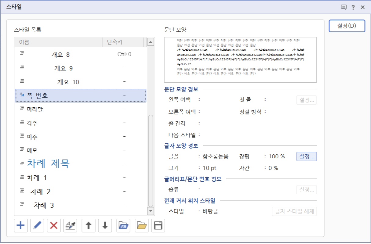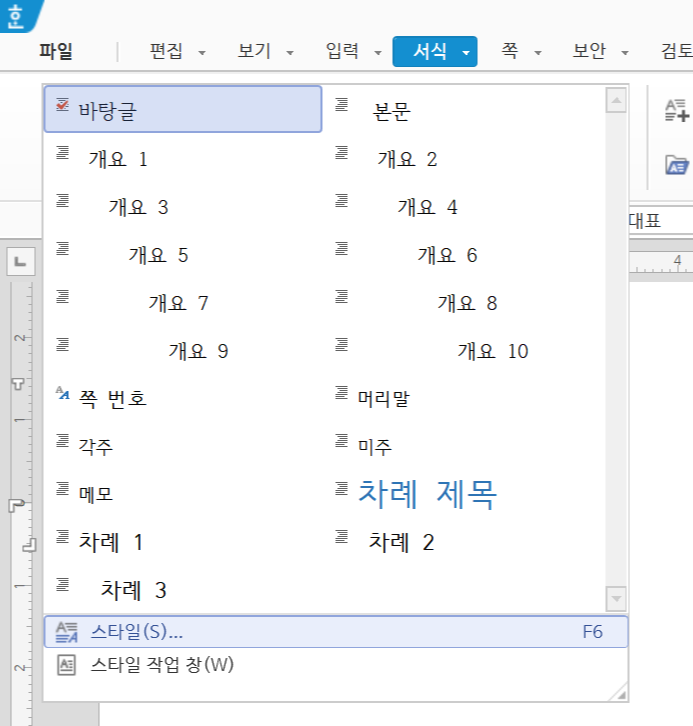 스타일은 "서식" 메뉴에서 찾아 들어가 바꿀 수도 있지만, 본문 아무 곳에서나 마우스 우클릭을 하면 중간쯤에 "스타일"이 있고, 단축키로는 F6을 눌러도 된다.