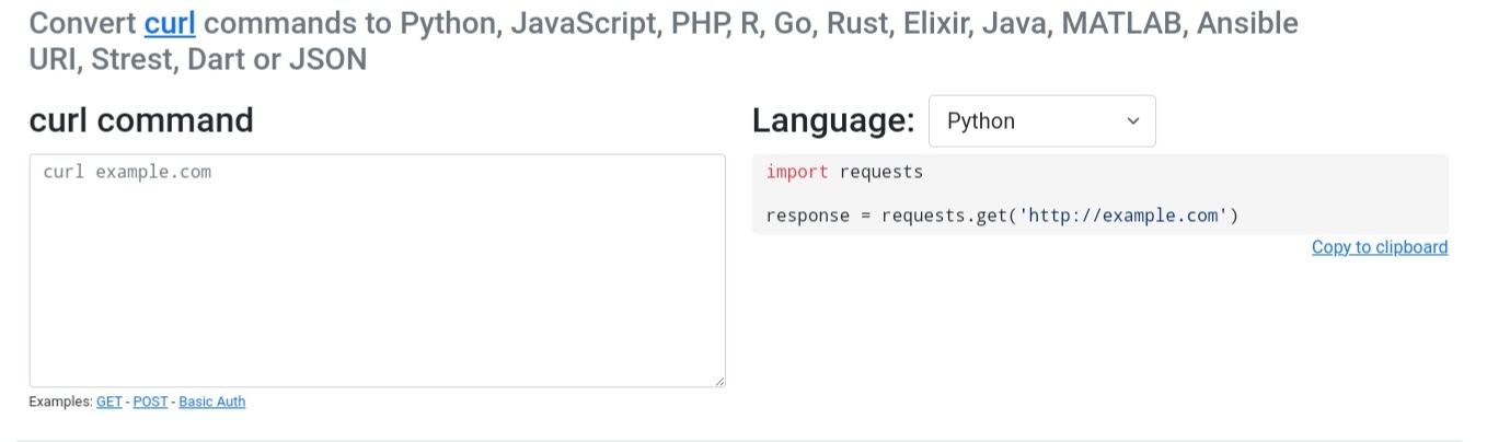 curlconverter 홈페이지(https://curlconverter.com/)에 접속해 curl command 박스에 위에서 복사한 curl 커맨드를 붙여 넣기만 하면 자동으로 파이썬 requests 코드로 변환을 해준다.