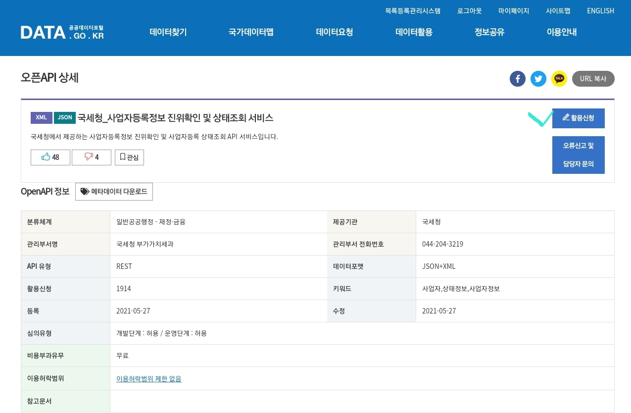 해당 서비스는 원래 국세청 홈페이지에서 사업자등록번호를 입력하여 휴폐업 여부 등을 확인할 수 있도록 해주는 웹서비스였는데, 올 여름부터 오픈 API로 제공되기 시작한 것이다.