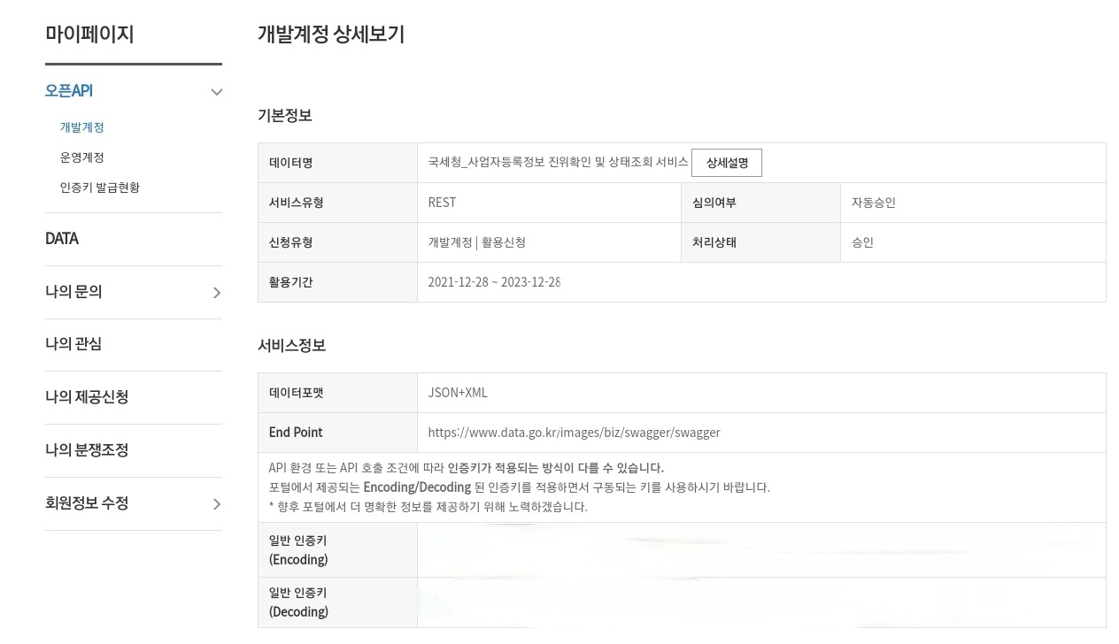 여기에서는 국세청의 사업자등록 상태 조회 서비스를 예제로 공공데이터포털에서 제공하는 오픈 API를 활용하는 방법을 소개하려 한다.
