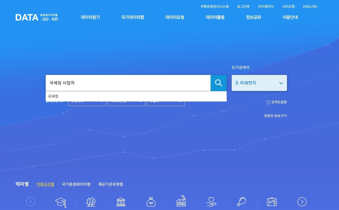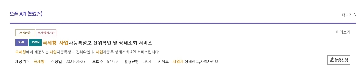 로그인을 마쳤다면 이번 예제에서 사용해볼 오픈 API를 찾아 들어가 보자. 메인 화면에서 "국세청 사업자"를 검색한다.
