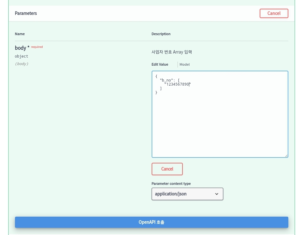 이제 API를 사용할 준비가 다 됐다. 다시 "사업자등록 상태조회 API"로 돌아와 "OpenAPI 실행 준비" 버튼을 누르자. 그러면 아래에 있던 검은 박스가 하얗게 바뀌면서 편집이 가능해진다.