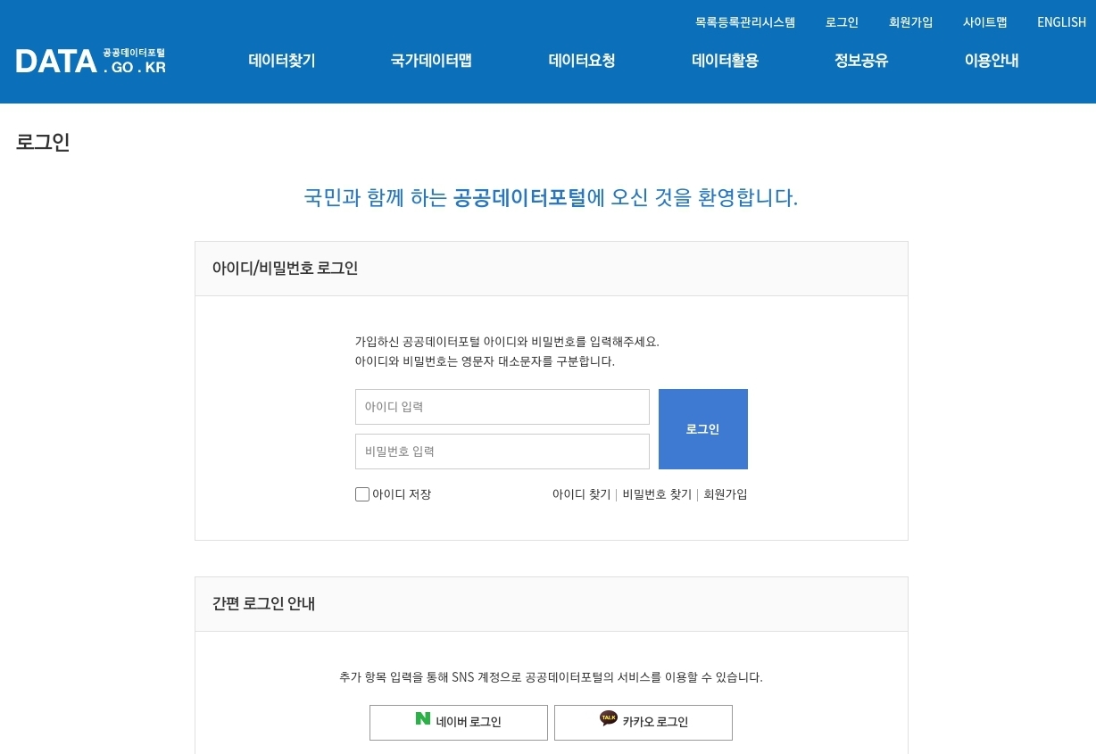 공공데이터포털에서 파일데이터 다운로드는 로그인 없이도 할 수 있지만, 오픈 API를 사용하려면 로그인을 해야 한다.