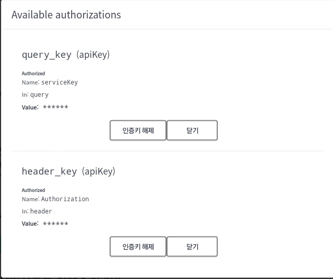 화면을 위에서부터 보면 "기본정보", "서비스정보", "활용신청 상세기능정보"가 나오고, 그 밑 화면 중간쯤에는 아래와 같이 API를 실행해볼 수 있도록 되어 있다.