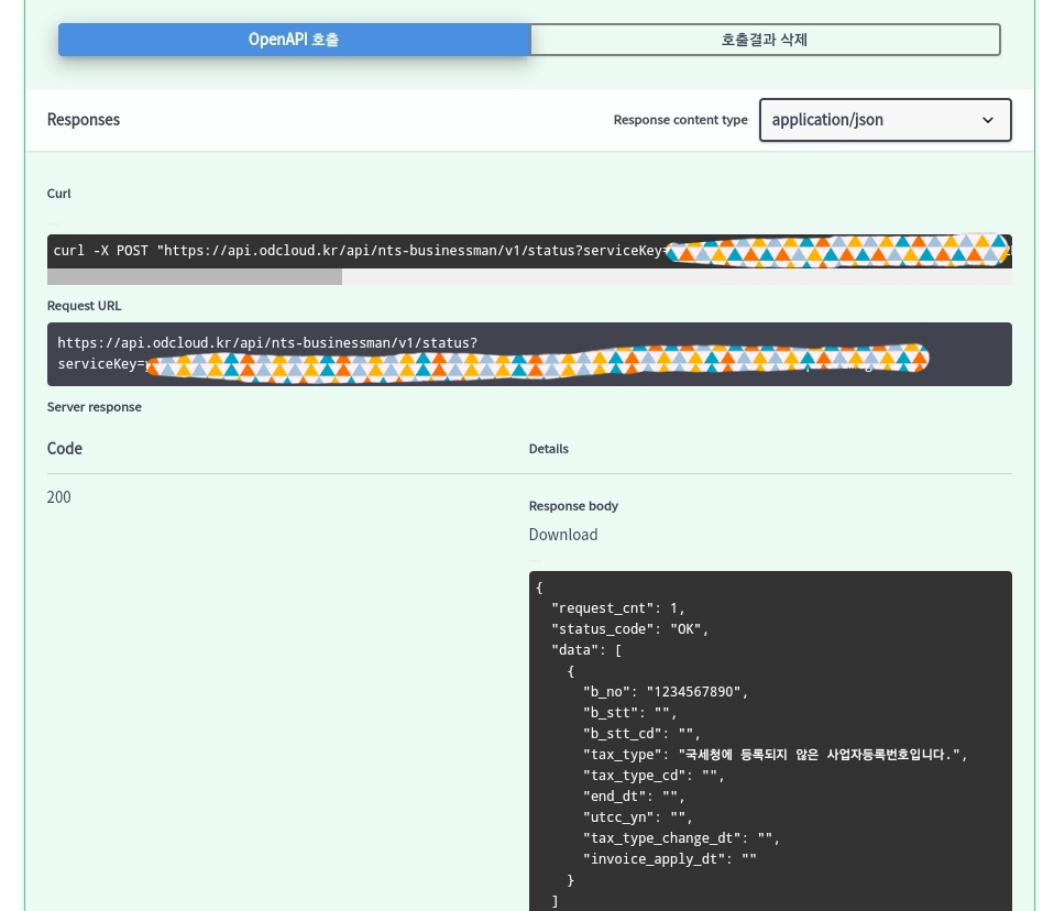 ~ $ curl -X POST "https://api.odcloud.kr/api/nts-businessman/v1/status?serviceKey=[본인의 서비스키 입력] -H "Content-Type: application/json" -d "{ \"b_no\": [ \"1234567890\" ]}"