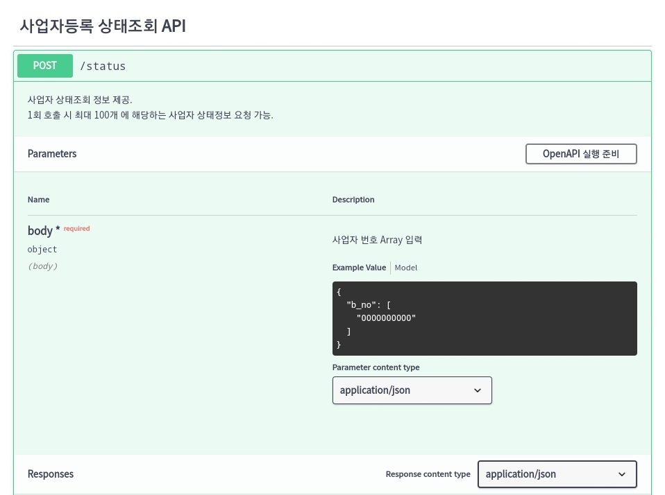 이제 API를 사용할 준비가 다 됐다. 다시 "사업자등록 상태조회 API"로 돌아와 "OpenAPI 실행 준비" 버튼을 누르자. 그러면 아래에 있던 검은 박스가 하얗게 바뀌면서 편집이 가능해진다.