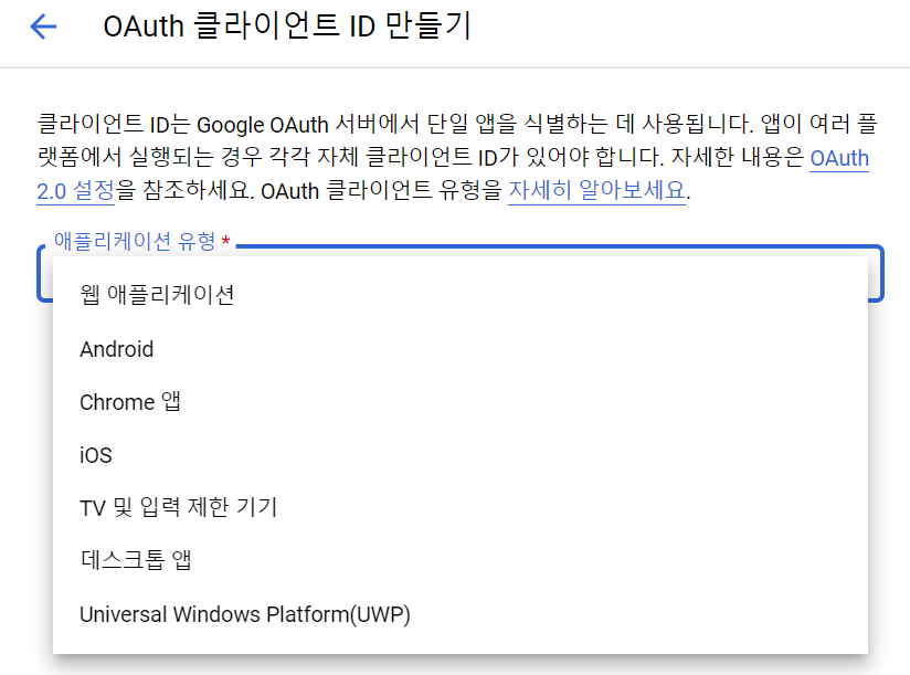 그러면 애플리케이션 유형을 선택하라고 하는데, 본인이 만들려는 앱에 따라 다르겠지만 예제만 따라 해 볼 거라면 "데스크톱 앱"을 선택해주면 된다. 그러면 별다른 추가 정보 입력 없이 바로 "만들기"를 클릭할 수 있다.