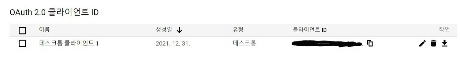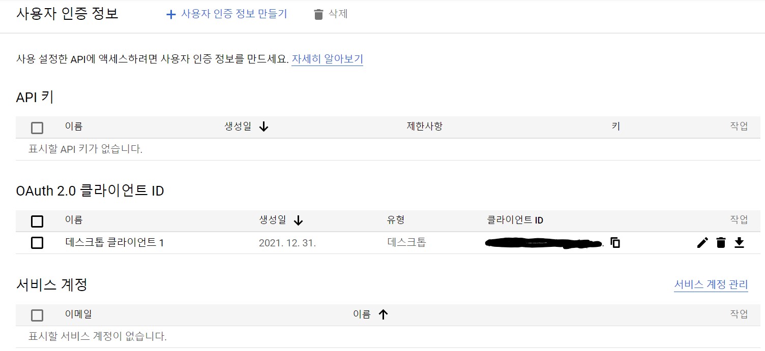 여기에서 만든 클라이언트 ID 정보는 API 호출 시 사용해야 하므로 "사용자 인증 정보" 페이지에서 다운로드 아이콘을 눌러 .json 파일로 다운로드하여 둔다.