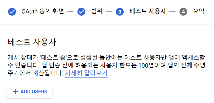 테스트만 해볼 것이기 때문에 앱 이름이나 이메일 등은 아무렇게 나 넣어도 무방하며, 다만 "테스트 사용자" 입력 단계에서 "ADD USERS"를 선택해 본인의 이메일 주소를 넣어줘야 인증이 진행되는 것 같으니, 빠뜨리지 말고 넣어준다.