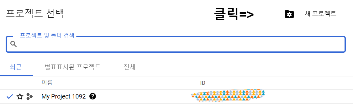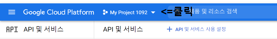 API Console 페이지 상단에서 아래 표시된 부분을 클릭하고, 새로 뜨는 창의 우상단에 있는 "새 프로젝트"를 클릭한다.(필자는 이미 프로젝트를 만든 상태여서 "My Project 1092"라는 이름이 표시되고 있다.)