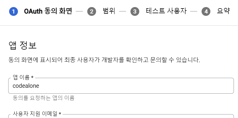 아까 선택했던 "라이브러리" 밑에 있는 "OAuth 동의 화면"을 선택하고, "앱 이름" 등 * 표시가 붙어 있는 필수 정보들을 입력해준다.