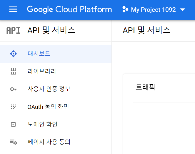 구글 검색창에 "google API console"을 검색하거나, 아래 링크로 접속해보자. 그러면 "구글 클라우드 플랫폼" 내의 "API 및 서비스" 페이지로 접속이 된다.