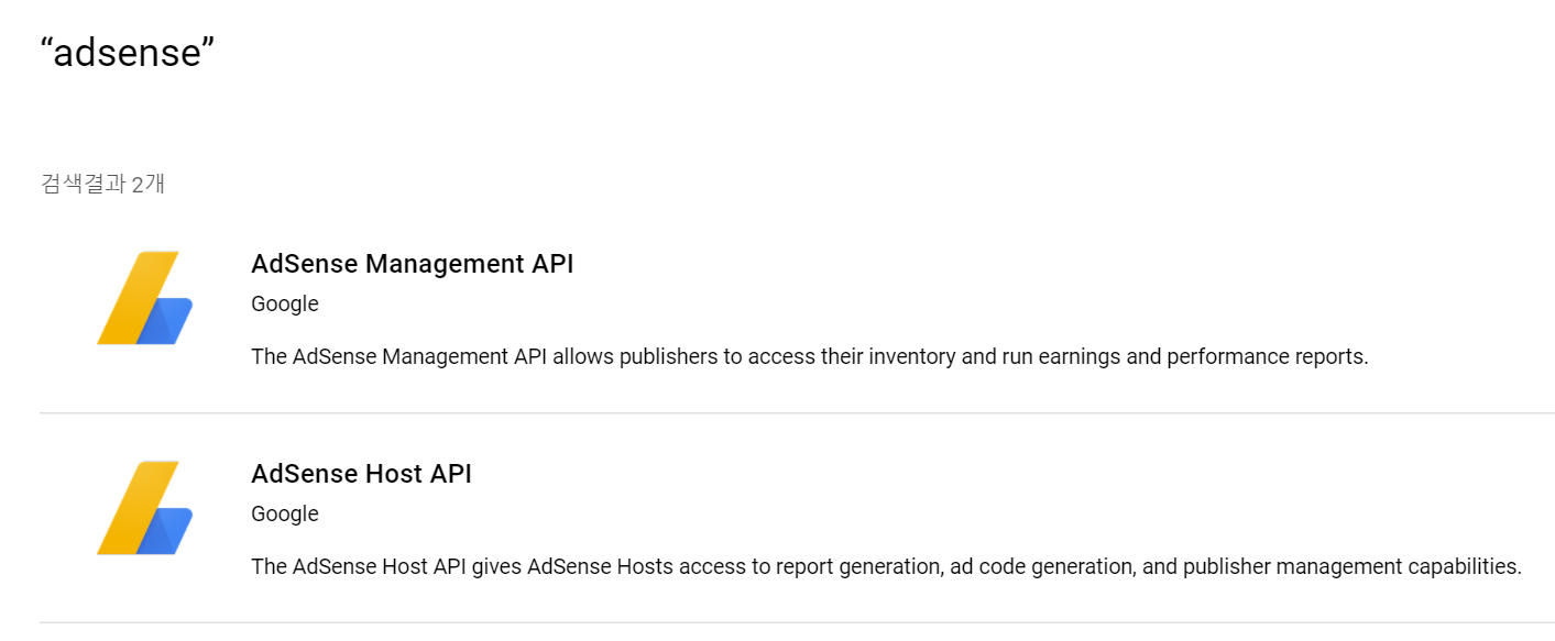 검색 결과 2개 중에 위에 표시되는 "AdSense Management API"를 선택한다.
