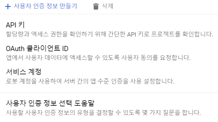 이제 사용자 인증 정보를 만들 차례이다. "사용자 인증 정보" 페이지를 들어가 보면 상단에 "사용자 인증 정보 만들기"가 보이고, 그 밑으로 API 키, OAuth 2.0 클라이언트 ID, 서비스 계정이 보일 것이다.