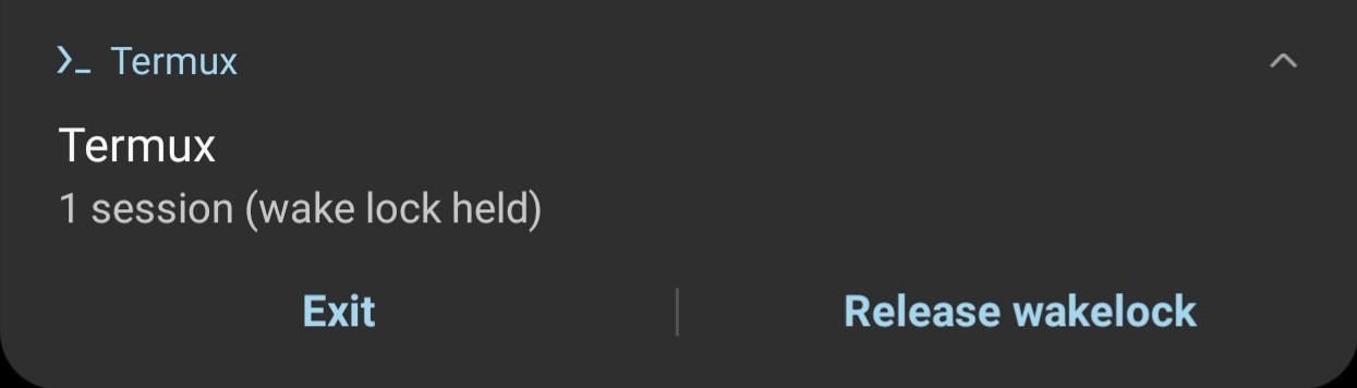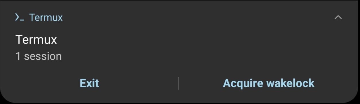 termux가 실행 중인 상태에서는 알림 창에 아래처럼 termux 세션이 실행 중이라고 표시되는데, 창을 확대해 보면 세션을 종료할 수 있는 exit 버튼 옆에 "aquire wakelock" 버튼이 있다.
