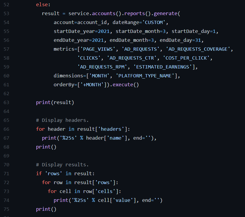 54번째 줄에서부터 61번째 줄에는 api를 호출할 때 넘겨주는 항목들이 보이는데, 55~56번째 줄은 애드센스 보고서를 불러올 기간, 57~59번째 줄은 불러올 항목에 해당한다.
