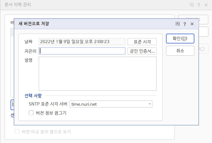 해당 아이콘을 눌러 보면, "새 버전으로 저장" 창이 뜨는데, 버전을 저장한 시점과 지은이(편집자)가 누구인지와 함께 간단한 설명까지 기록할 수가 있게 되어 있다.