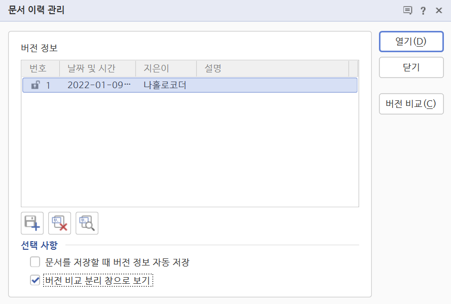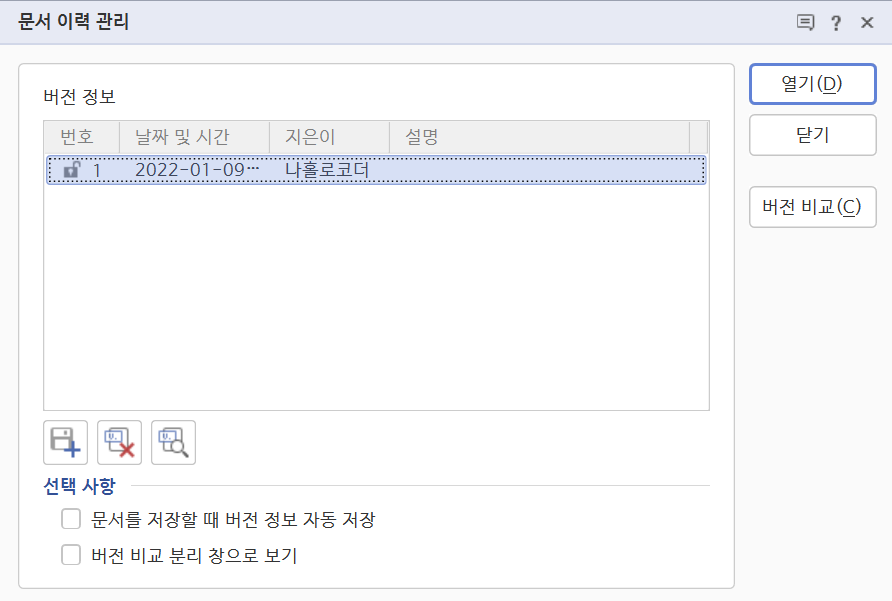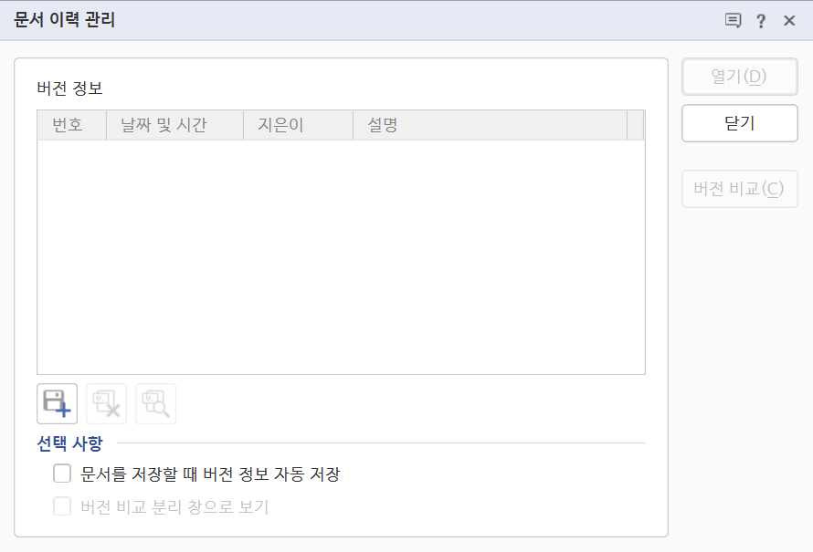 "문서 이력 관리" 버튼을 눌러 보면, 아래와 같이 이력 관리 창이 뜨는데, 플로피 디스크 모양의 아이콘을 누르면 현재 상태 그대로 버전을 생성해 주는 것이다.