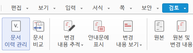 아래아한글 문서를 열고, 리본메뉴의 "검토" 탭으로 들어가 보면 "문서 이력 관리" 버튼이 있다.