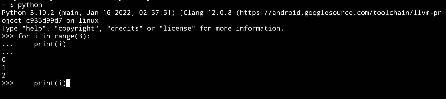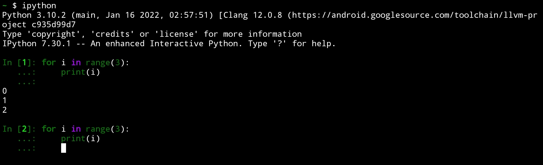위 코드를 파이썬 인터프리터와 IPython에서 입력하면, 첫 줄에서 for문이 끝나지 않았기 때문에 둘째 줄은 앞부분이 ... 표시로 바뀌면서 두 줄의 코드가 하나의 블록으로 처리가 되고, 둘째 줄을 입력하고 엔터를 두 번 치면 코드가 실행된다.