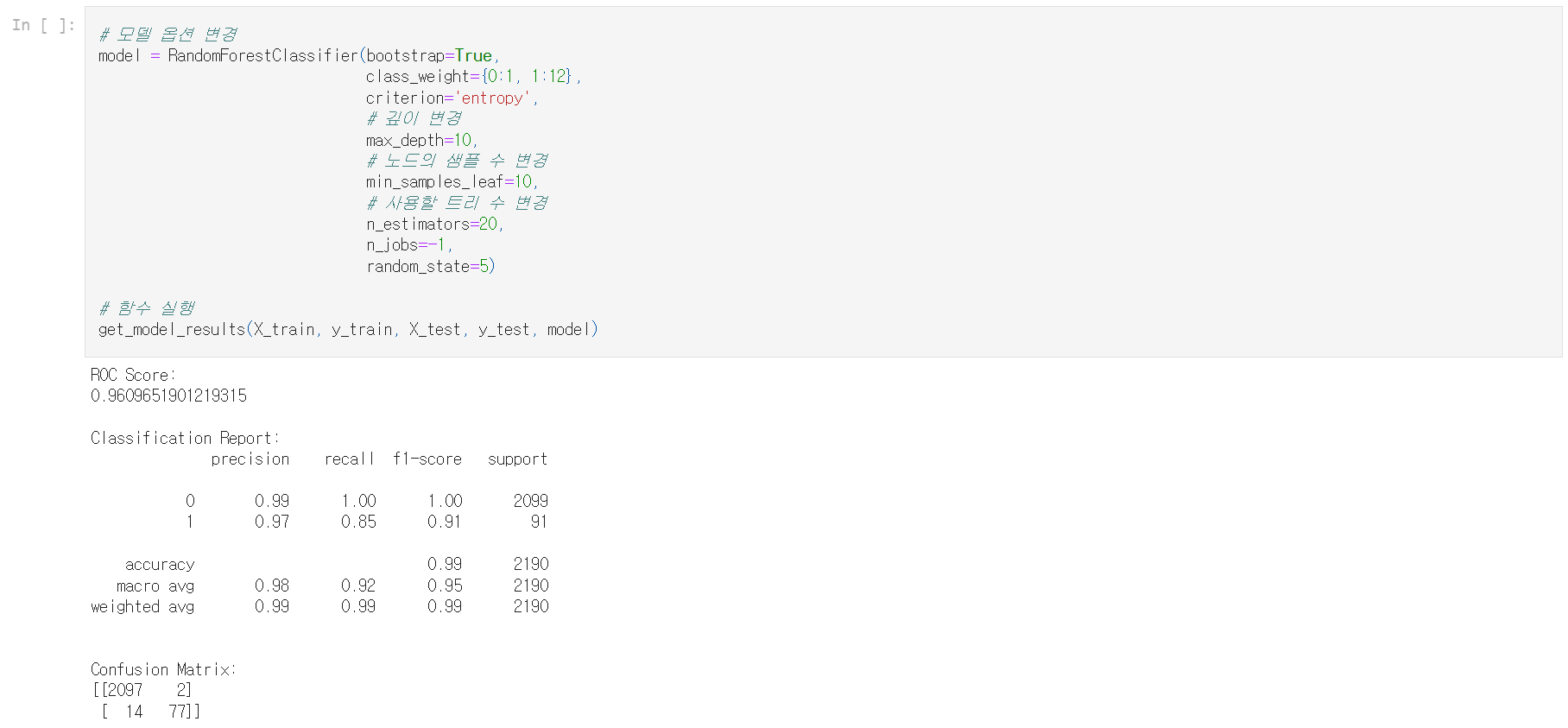 더 많은 옵션을 잘 정하면 더 나은 예측을 얻을 수 있다. FN를 효과적으로 줄였다. 즉 FP를 낮게 유지하면서 더 많은 부정거래를 탐지하고 있다.