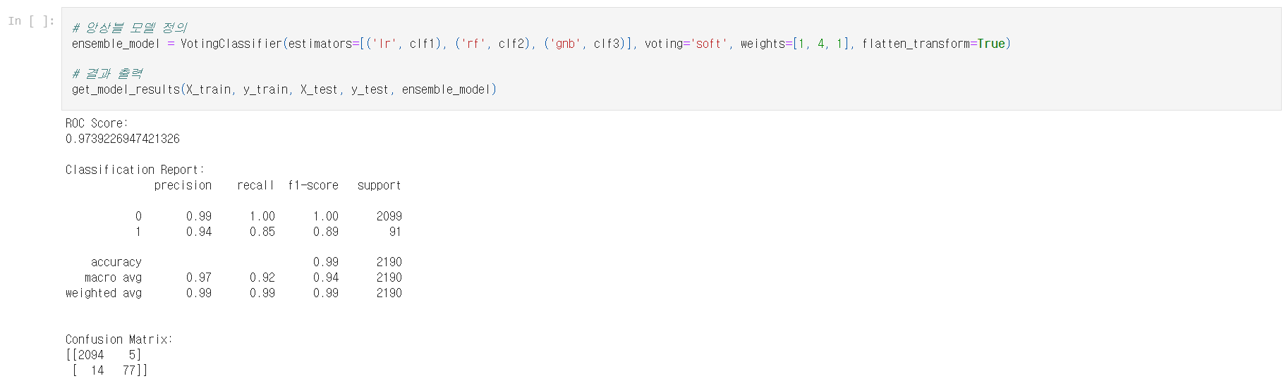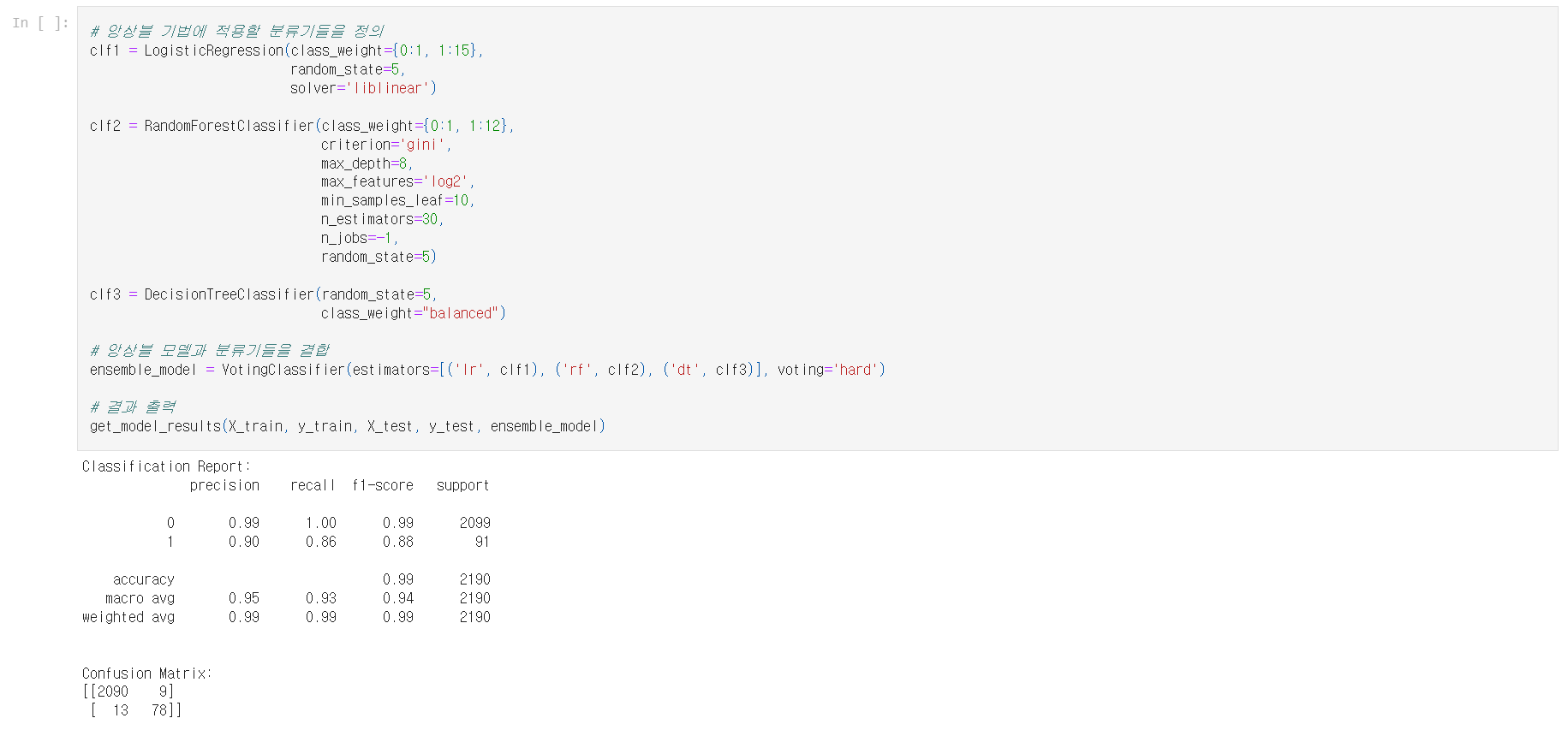 여기에서는 VotingClassifier를 사용하여 3개의 알고리즘을 하나의 모델로 결합한다. 이를 통해 모델들의 서로 다른 측면에서 이점을 얻을 수 있으며 전체 성능 개선하고 더 많은 부정 탐지를 기대할 수 있다.