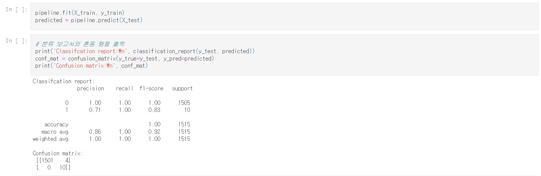 - 모델을 훈련 세트에 적합시키고 예측을 실행한 뒤, 분류 보고서와 혼동 행렬을 출력
