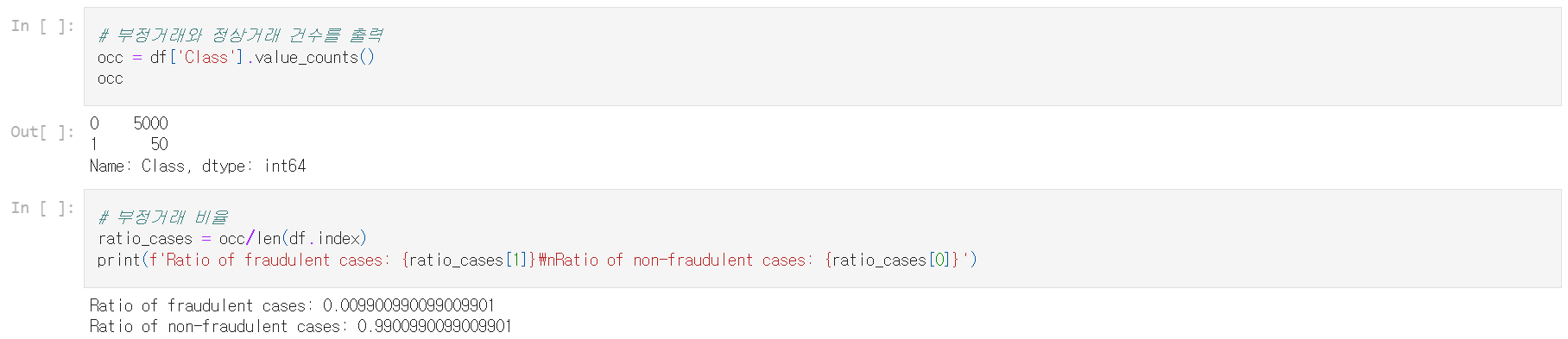 - .value_counts()를 사용하여 'Class' 열에서 부정거래와 정상거래의 수를 가져와 결과를 occ에 할당한다.