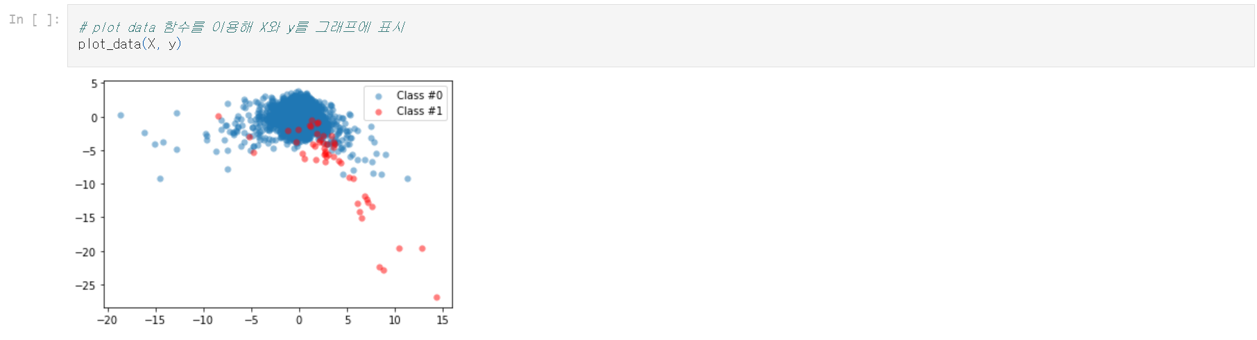 - X 및 y에 대해 plot_data() 함수를 실행하여 결과를 시각화