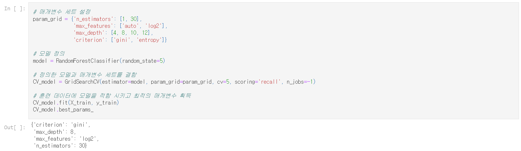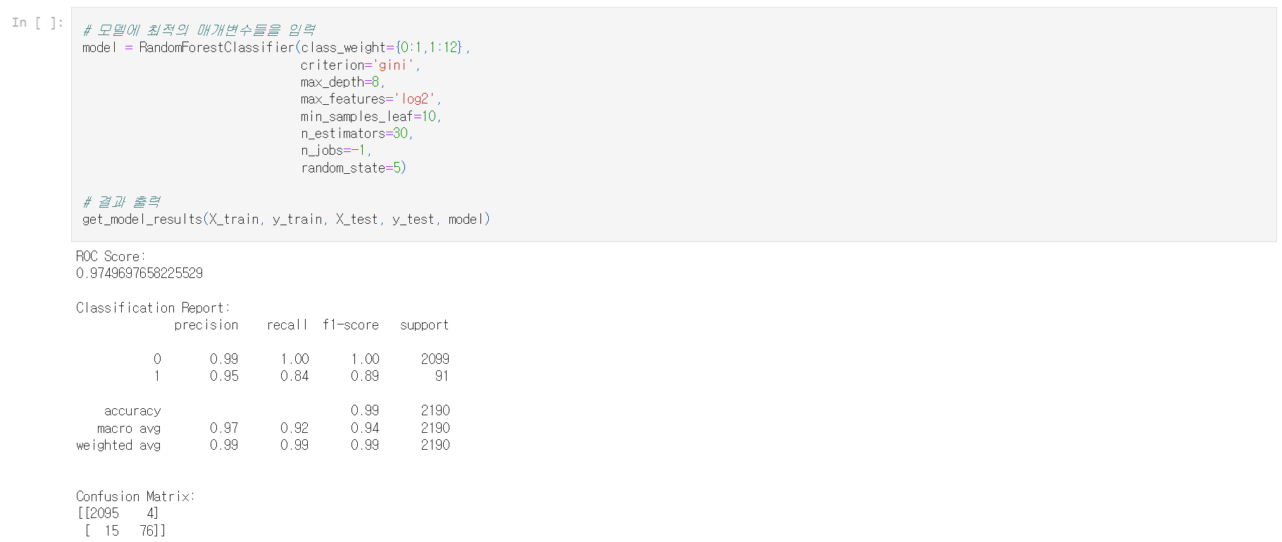 분할 기준은 'gini', 트리 수는 30개, 최대 깊이는 8 등으로 설정되어야 함을 확인했으니 모델에 적용해 성능을 보자.